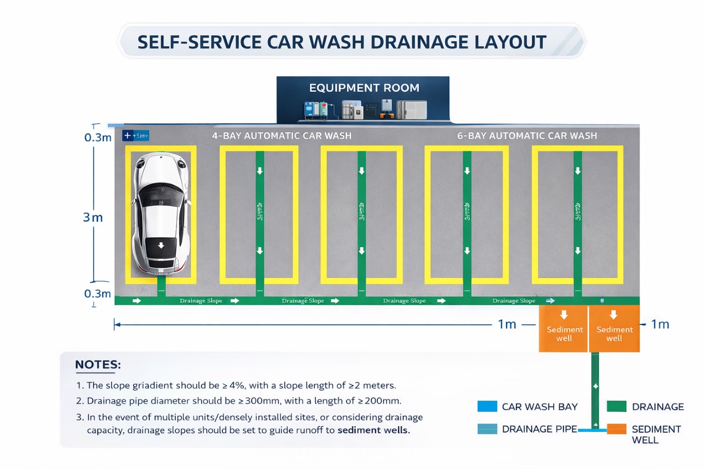 Professional drainage design for self-service car wash stations, ensuring efficient water flow, proper sediment separation, and stable long-term operation.